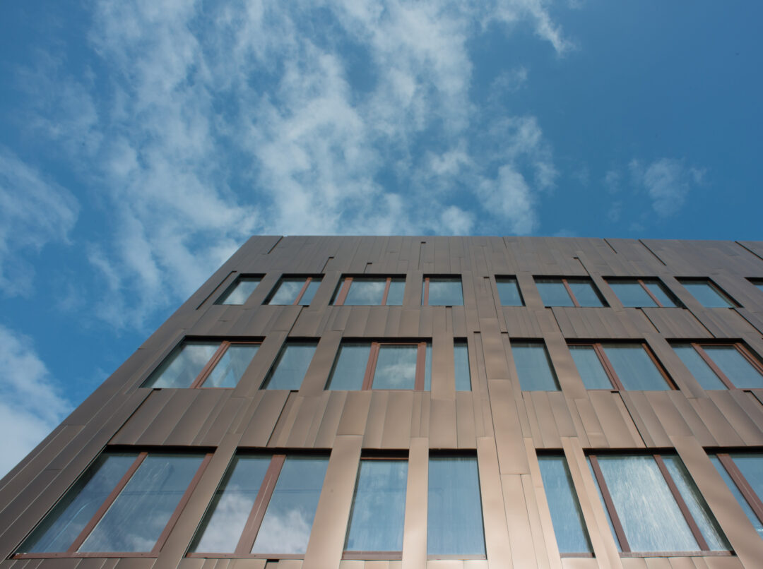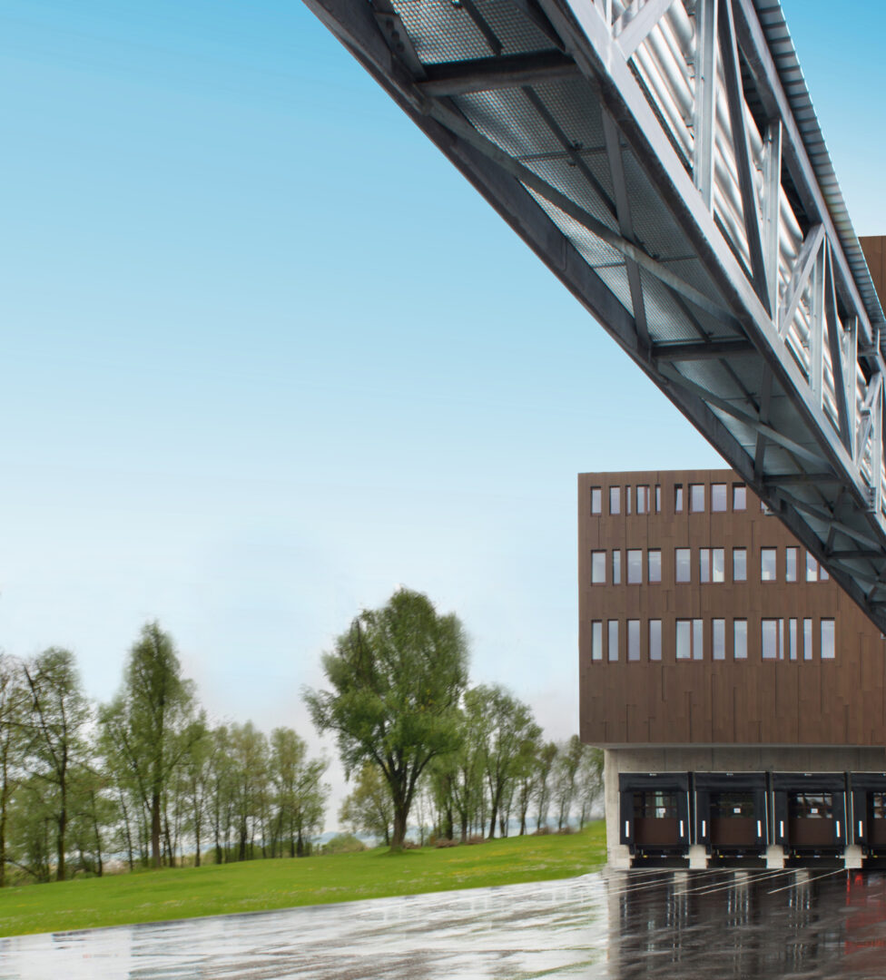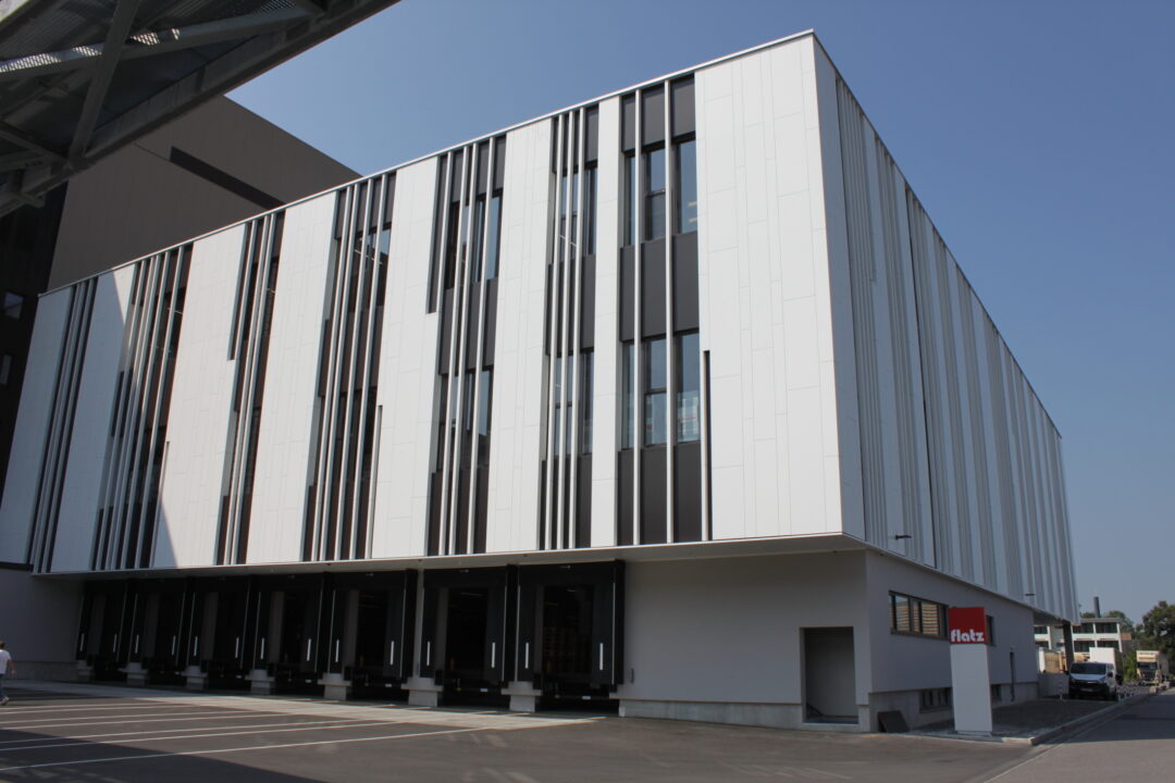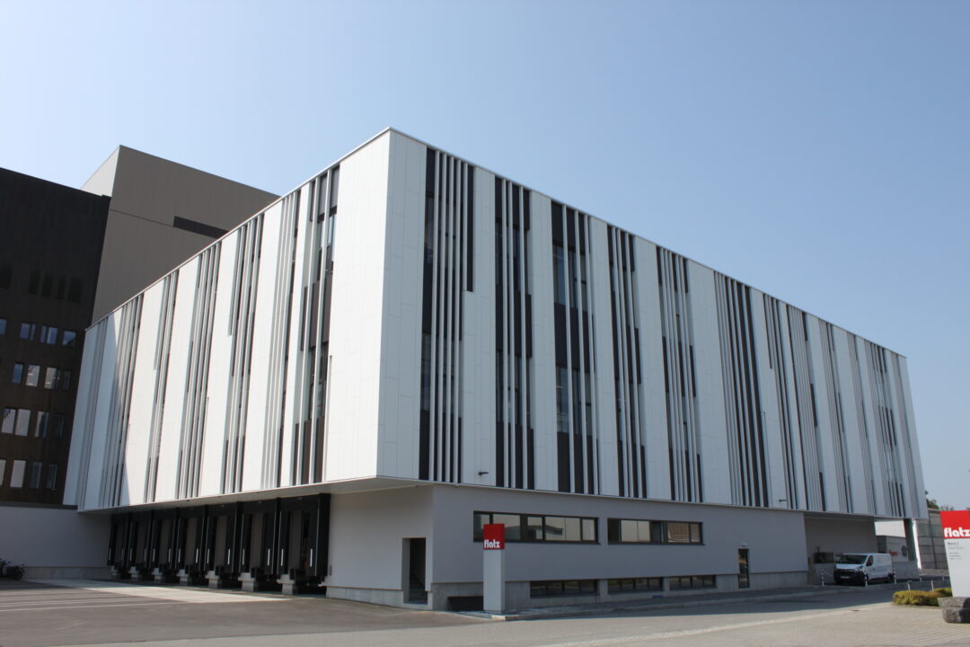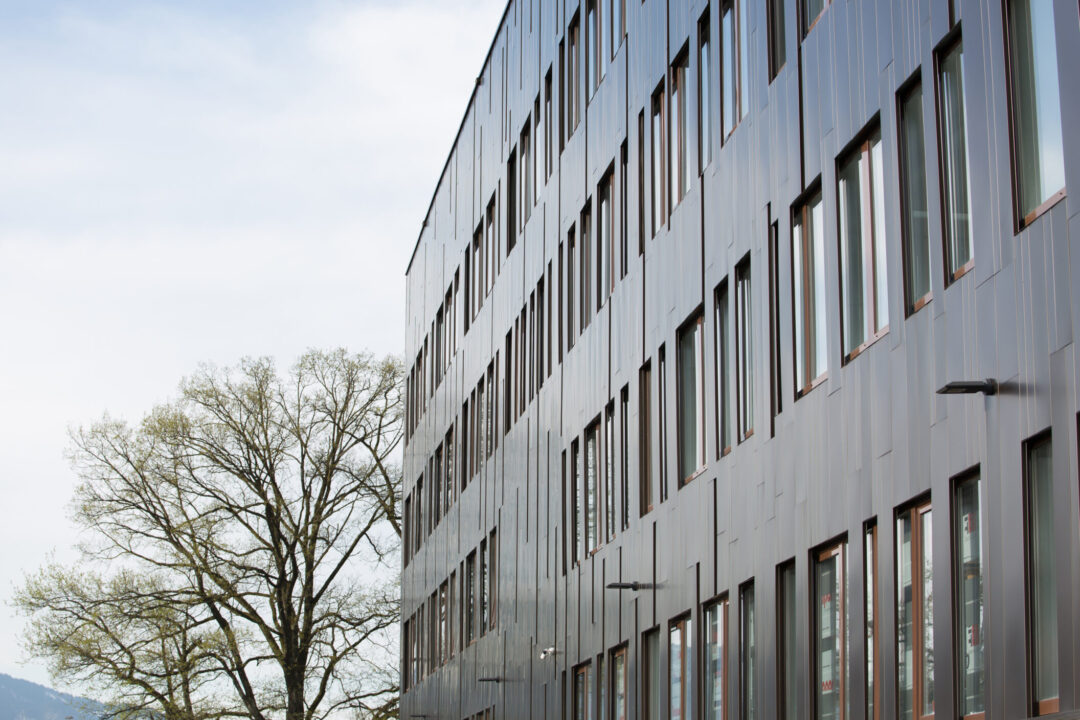 The factory premises of the packaging specialist Flatz are located right off the highway in Lauterach. The new multi-story production plant comprises of a reinforced concrete frame construction. A uniform facade with bronzed aluminum cassettes was developed for the huge structure with around 890,000 sqft. This makes the mighty structure appear compact and therefore visually smaller.