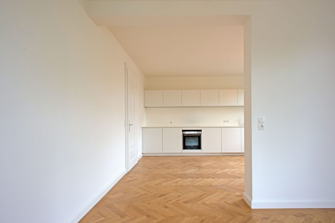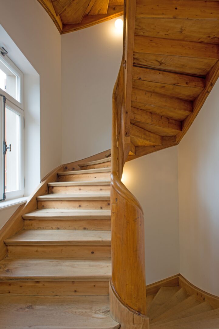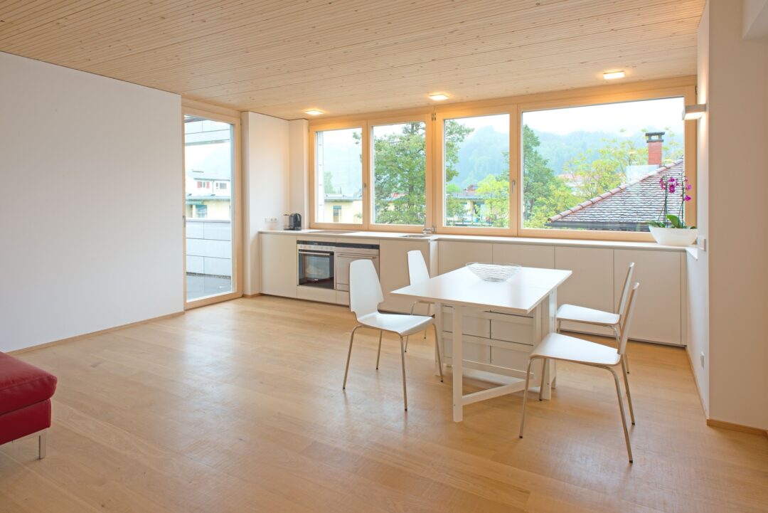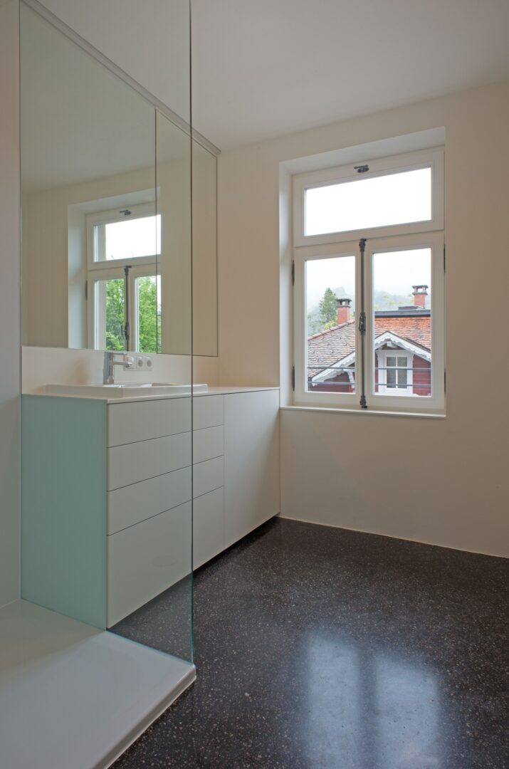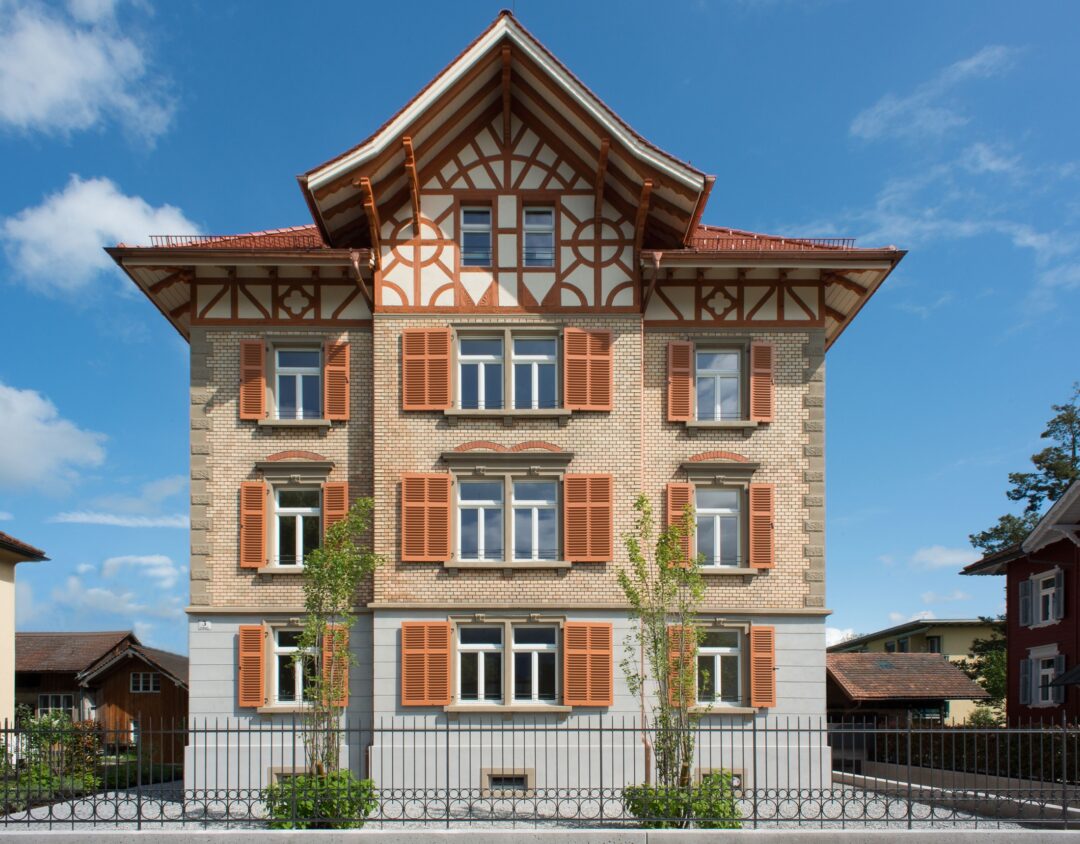 The apartment building to be renovated was built around 1901 in a district of Dornbirn close to the center with predominantly free-standing buildings. It was built in an era of economic and cultural boom that was important for the then young city of Dornbirn. The villa, which is now a listed building, was built as a middle-class residential structure with nine apartments. The facades are split up into three zones. The attic has ornamental green framed half-timbering to match the profiled purlins on the underside of the mansard roof with plain tile roofing.