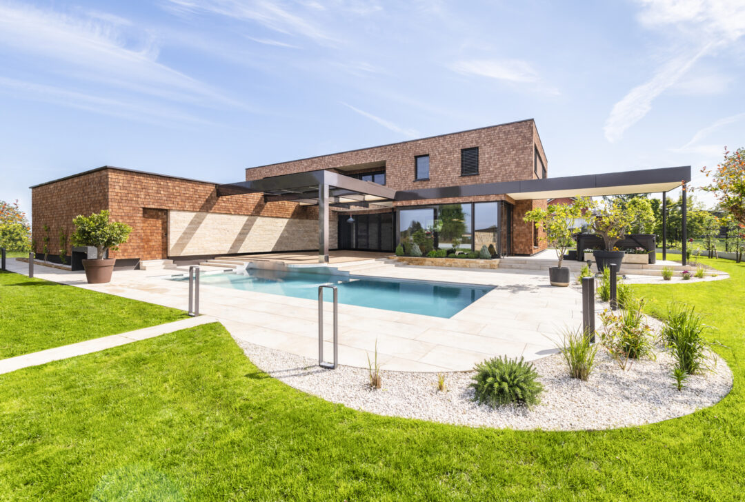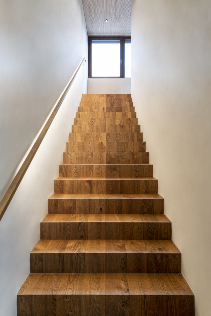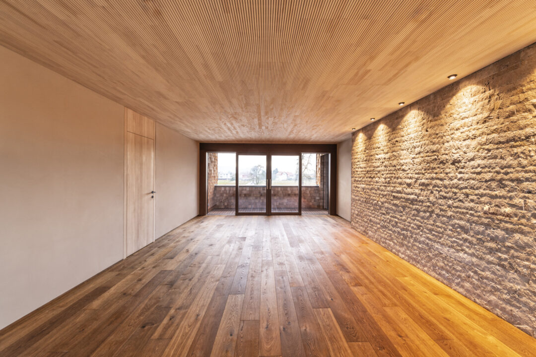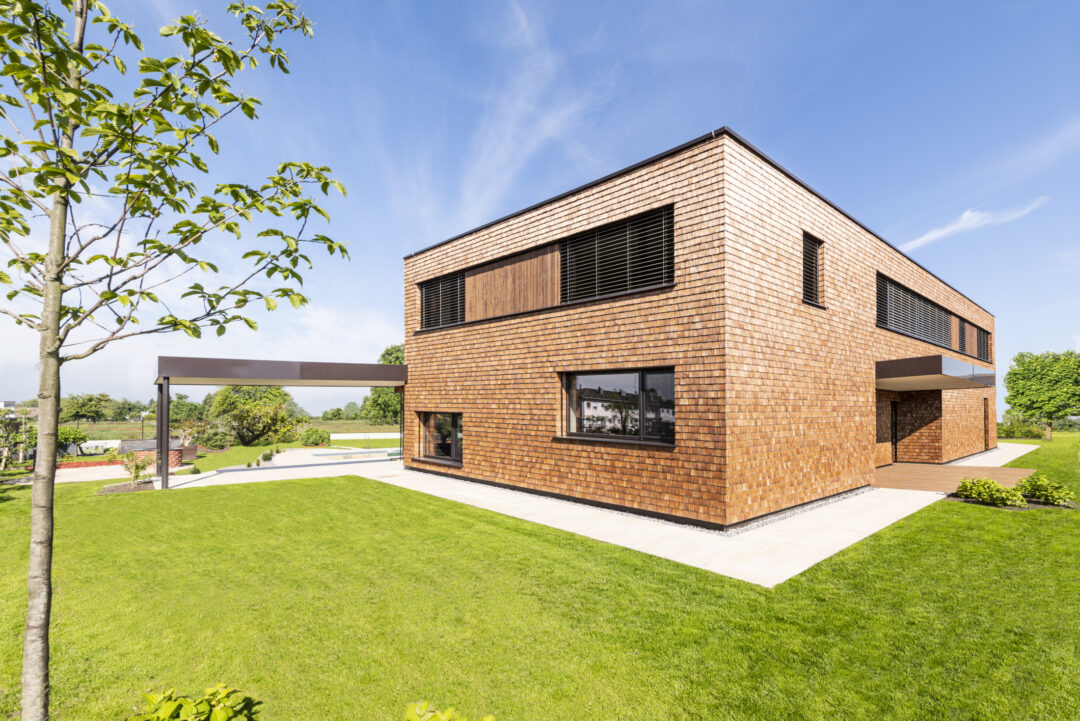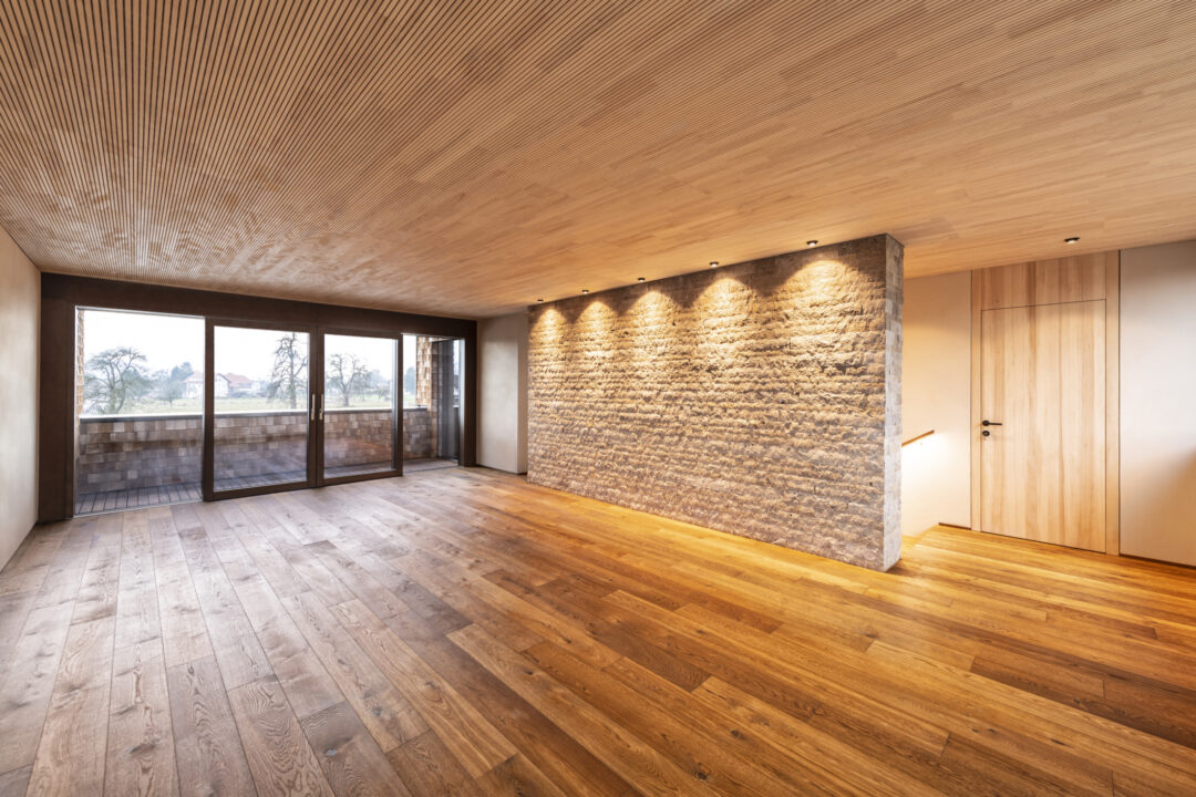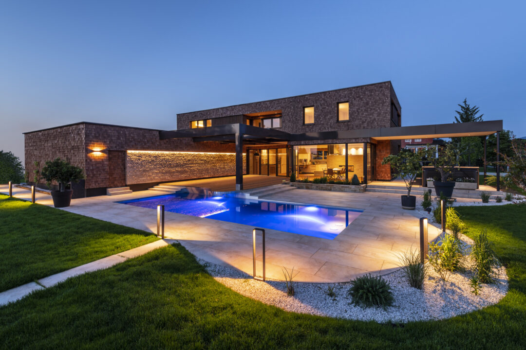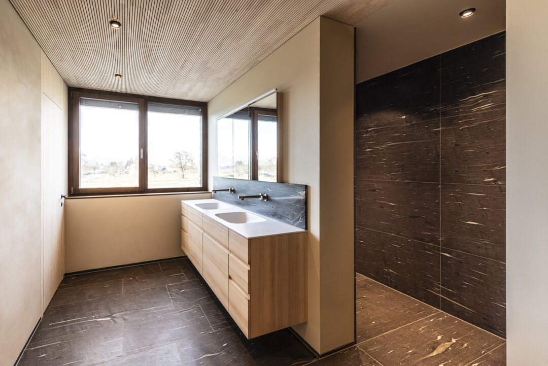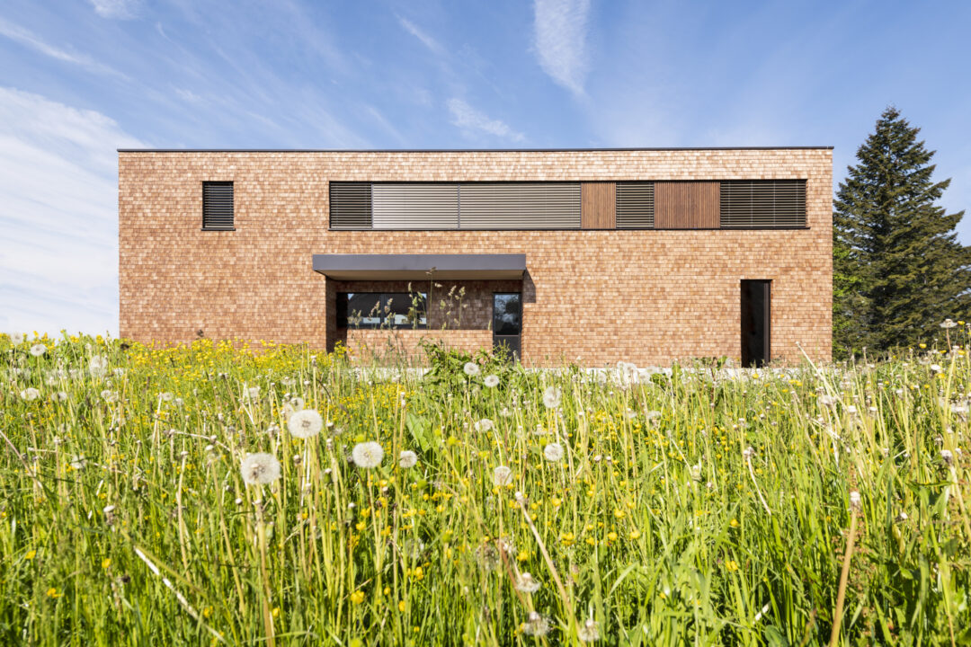 The L-shaped building with dark brown wood shingles is grouped around the spacious terrace and garden area with a stainless steel pool. The single-family homee itself was designed to be as natural and open as possible - the outer walls consist of 10 inches of solid wood. The interior surfaces were covered with clay panels and clay plaster. The doors and furniture are also made of solid wood from local silver fir or oak. The floor coverings are mostly smoked oak parquet.