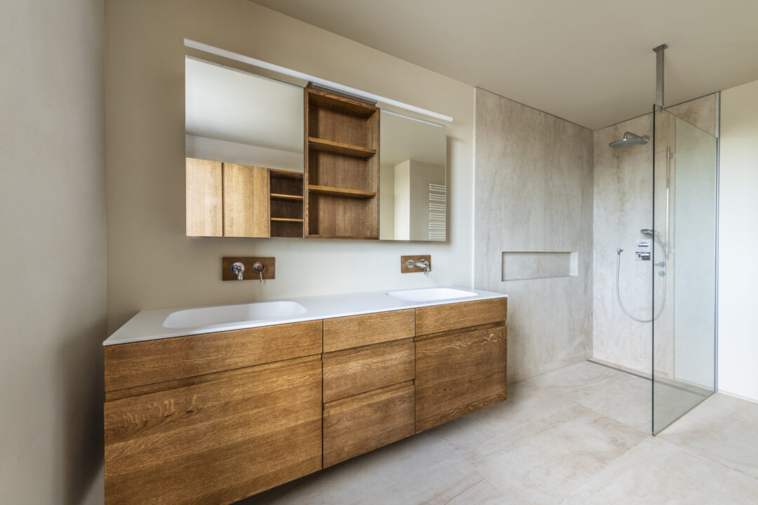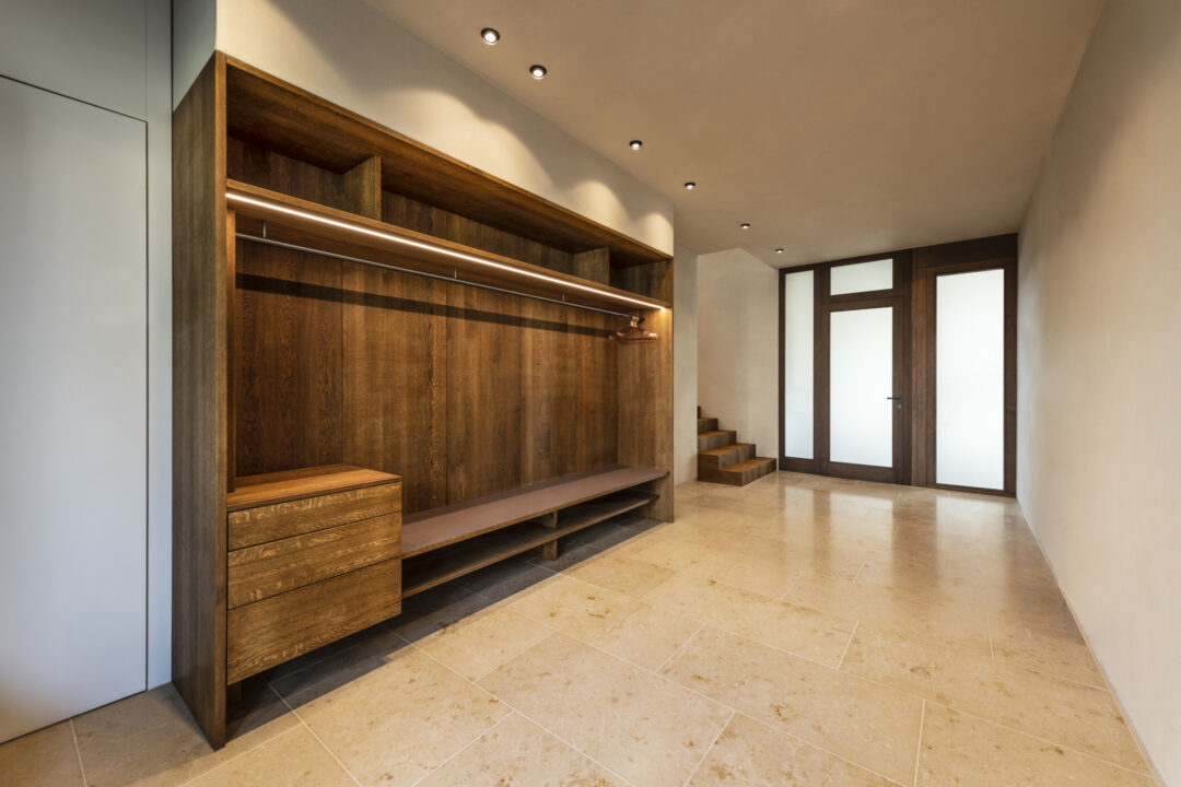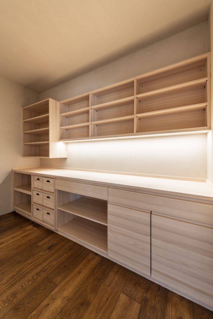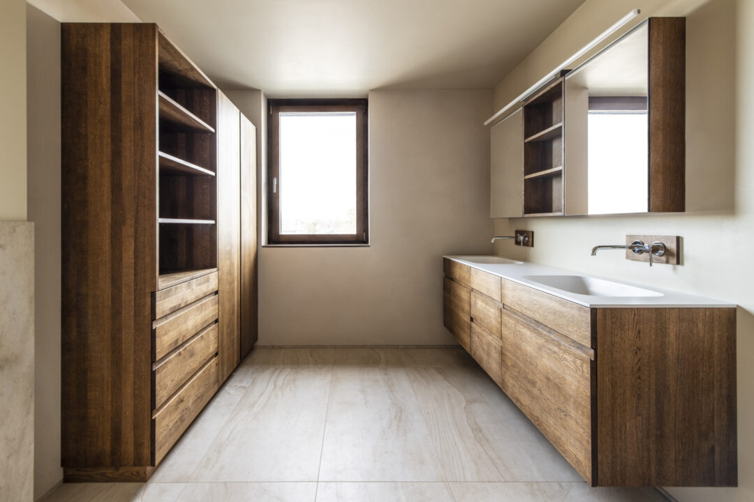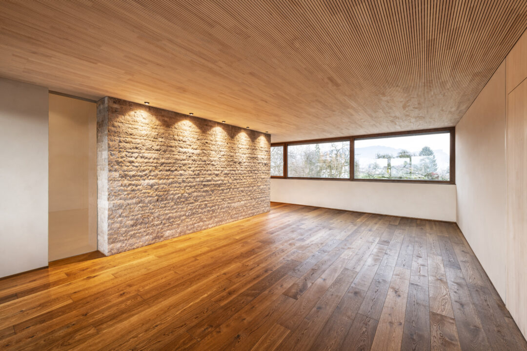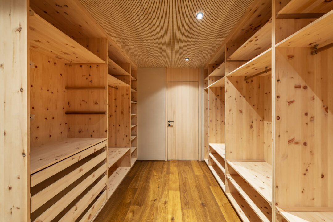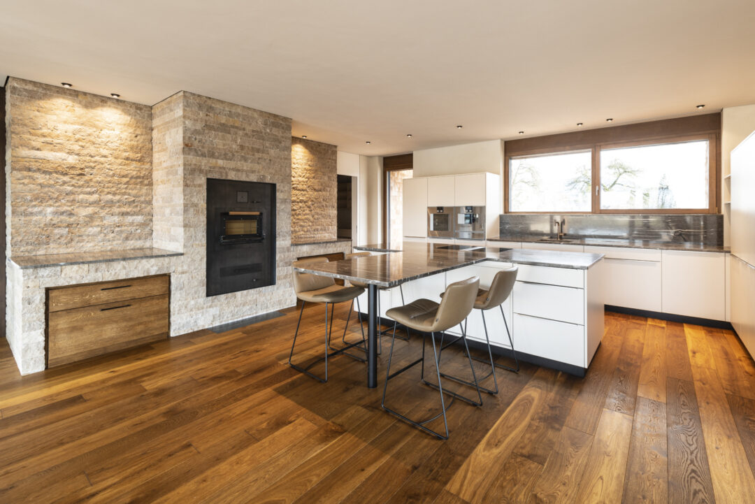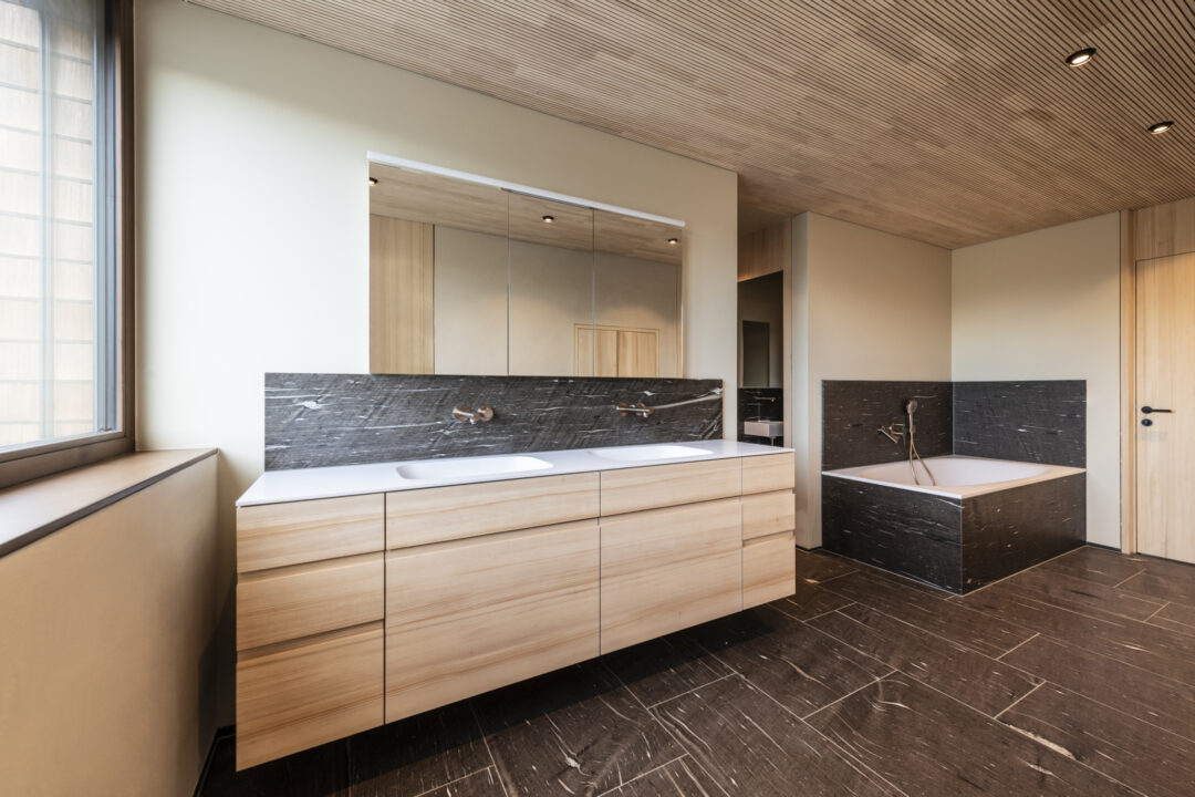 The L-shaped building with dark brown wood shingles is grouped around the spacious terrace and garden area with a stainless steel pool. The single-family homee itself was designed to be as natural and open as possible - the outer walls consist of 10 inches of solid wood. The interior surfaces were covered with clay panels and clay plaster. The doors and furniture are also made of solid wood from local silver fir or oak. The floor coverings are mostly smoked oak parquet.