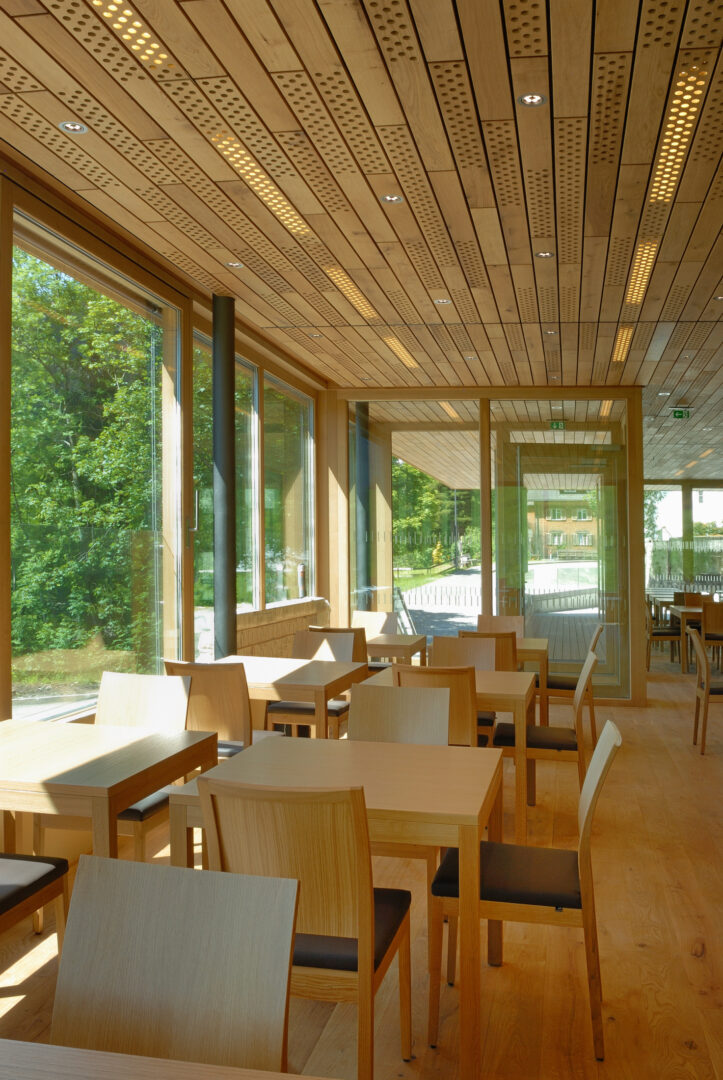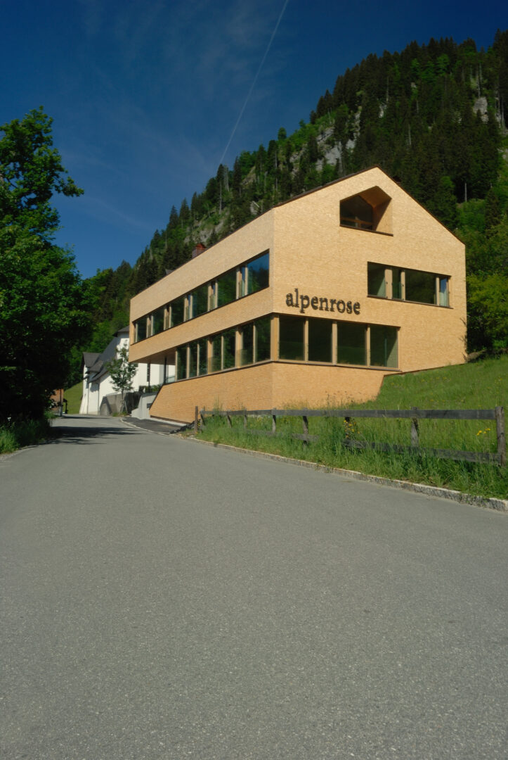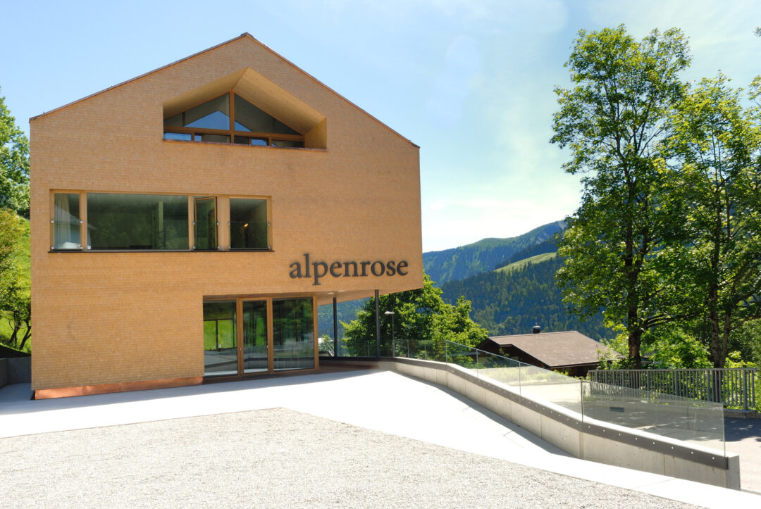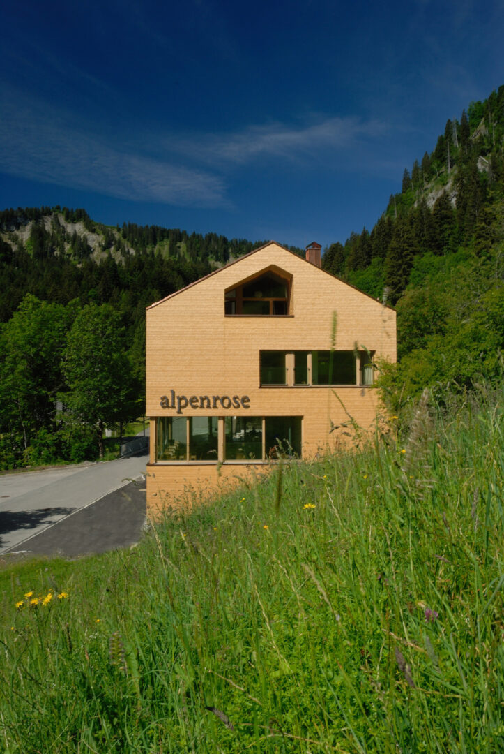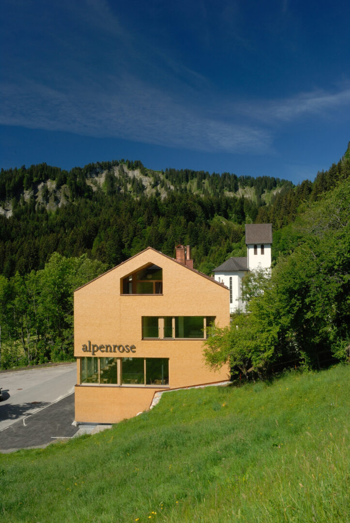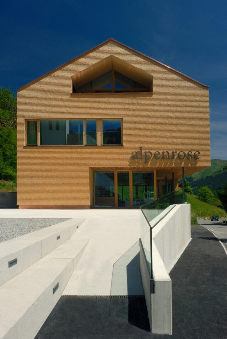Simple, down-to-earth and pure – this is how the village Ebnit presents itself to the numerous hikers and bikers - and that is exactly the language the architects used for the newly built Hotel Alpenrose. Without any roof overhangs, the simple, straight-lined building is reminiscent of a crystal against the rugged rocks of the surrounding area. Its deliberately traditional wooden shingle facade blends harmoniously into the image of local construction. The reduction of stylistic cues on the outer shell is reflected in the interior. Oak wood and an impressive view were the defining elements of the design and were used consistently.