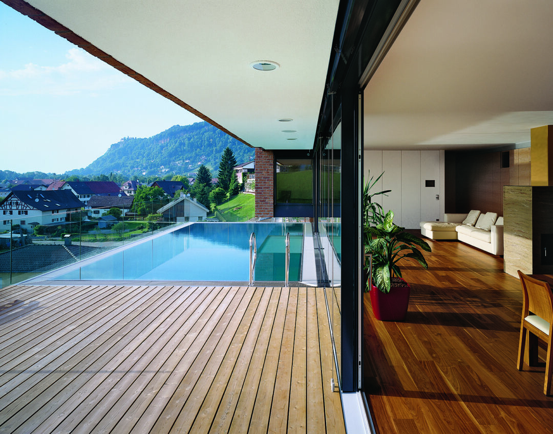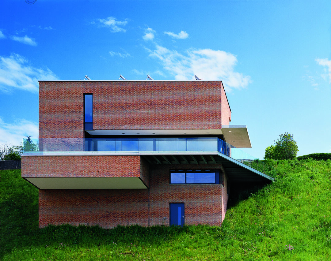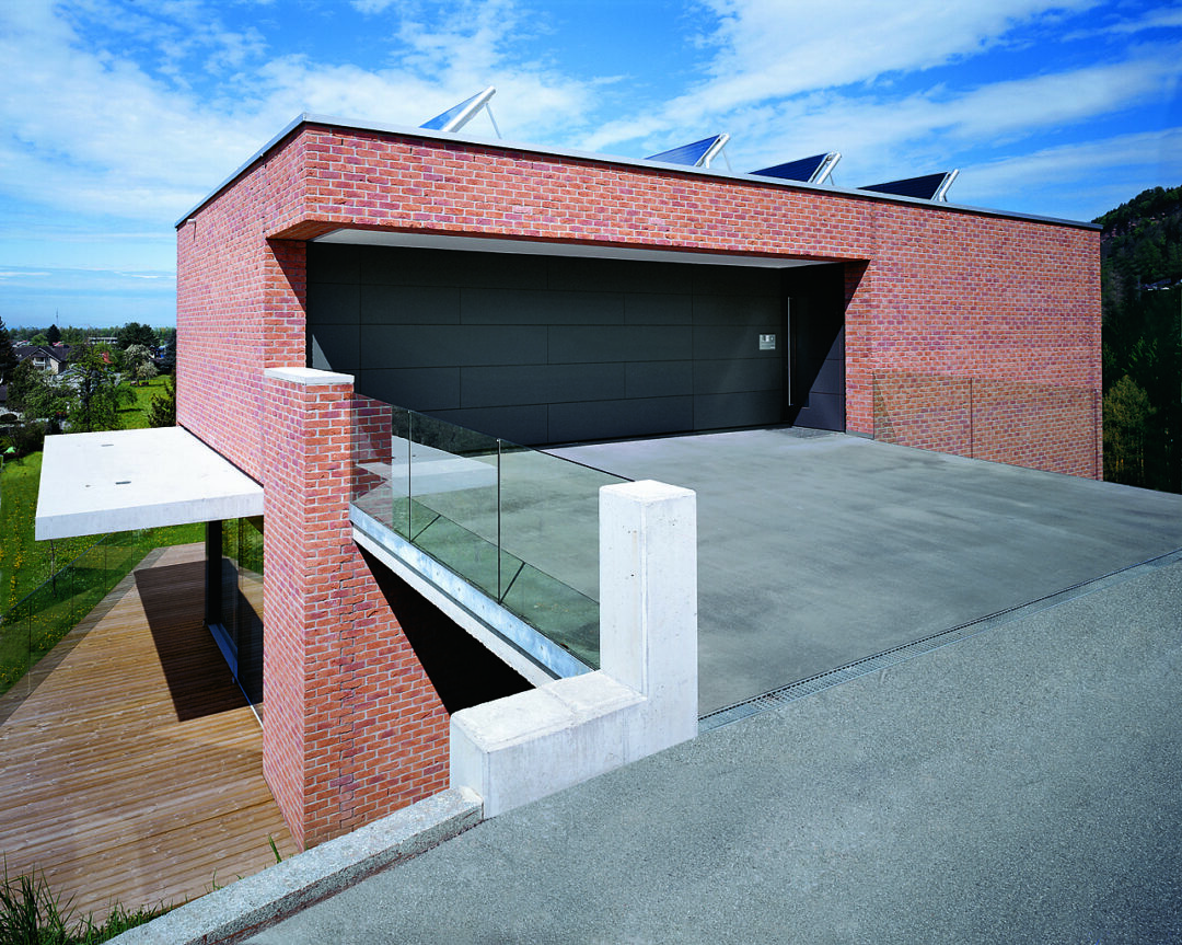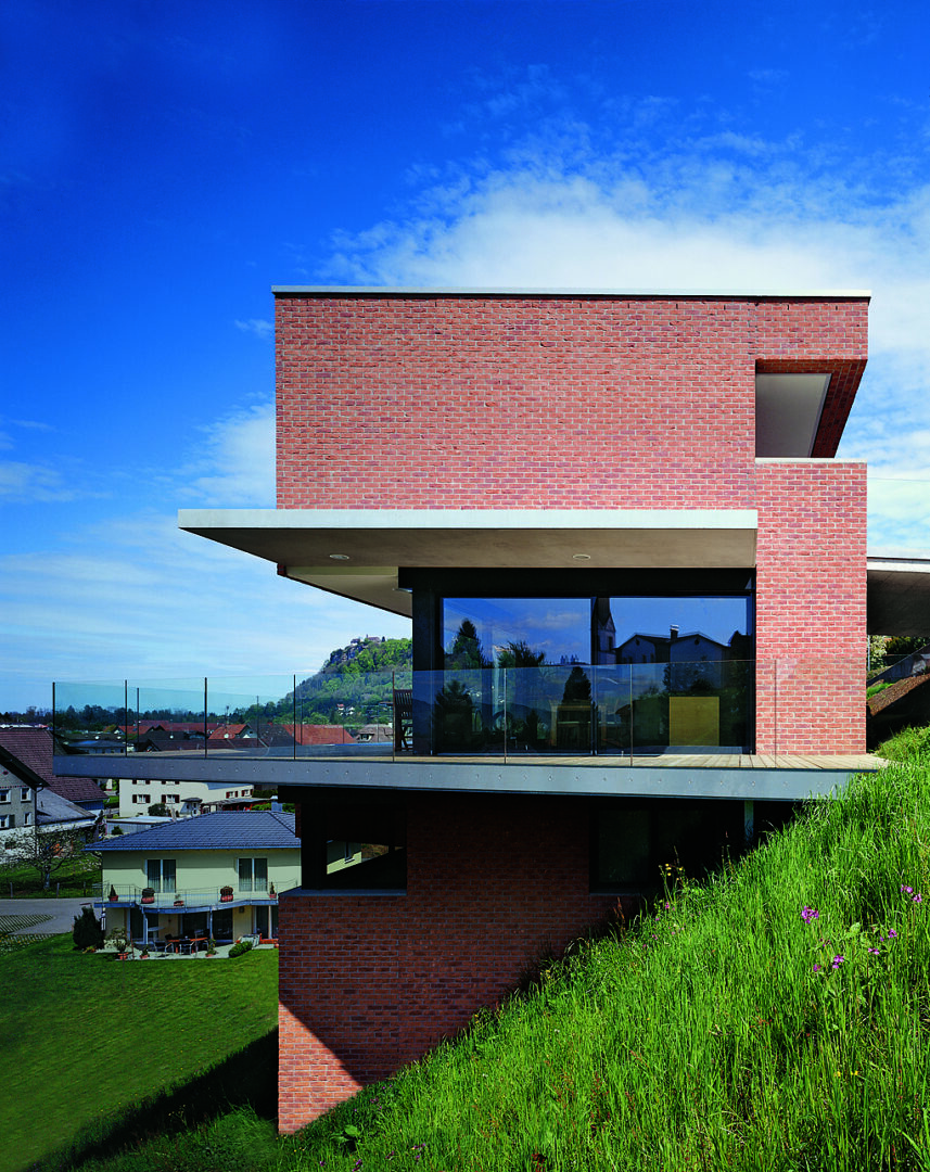 This cube with a flat roof is elegant, luxurious and simple. With its brick facade it seems to be set into the slope like a gemstone. Due to the hillside location, the house is facing west. Lots of glass ensures a good climate and lots of light. Due to the change in elevation, the house´entrance is on the top floor, which is also accommodates the garage. Living areas are on the two floors below, where people meet to live, cook and eat. The bedrooms and bathroom areas are located down one more floor.