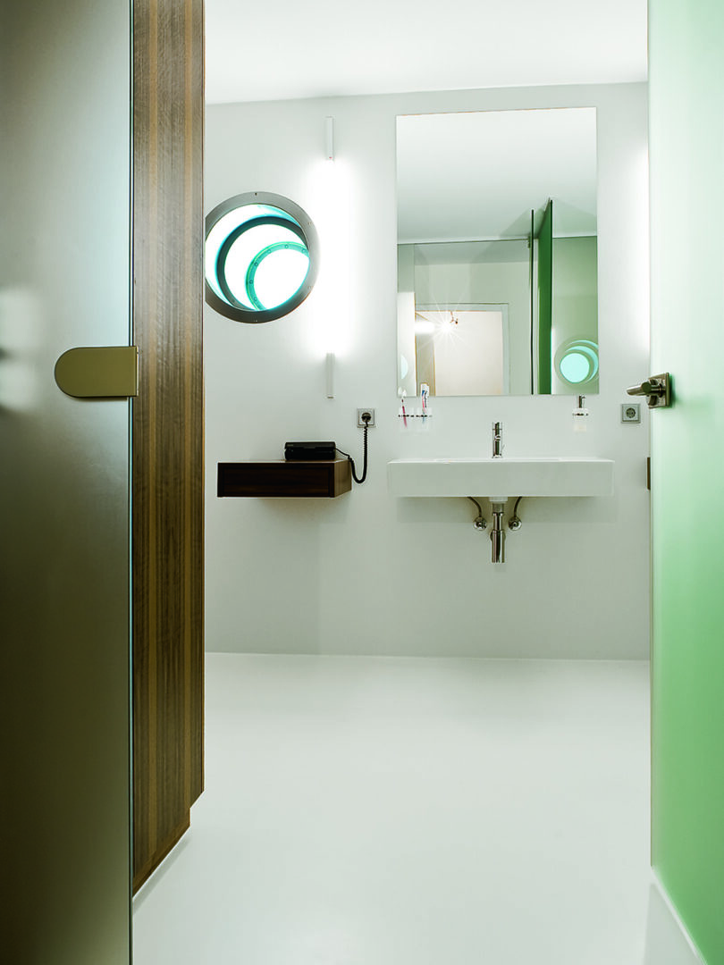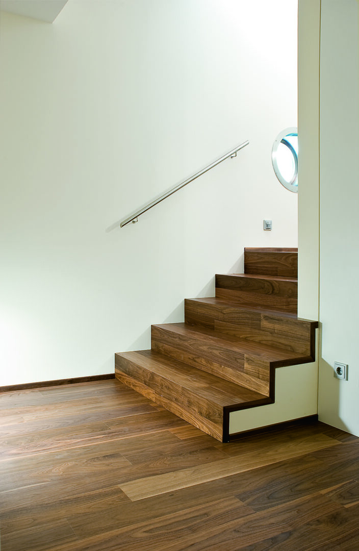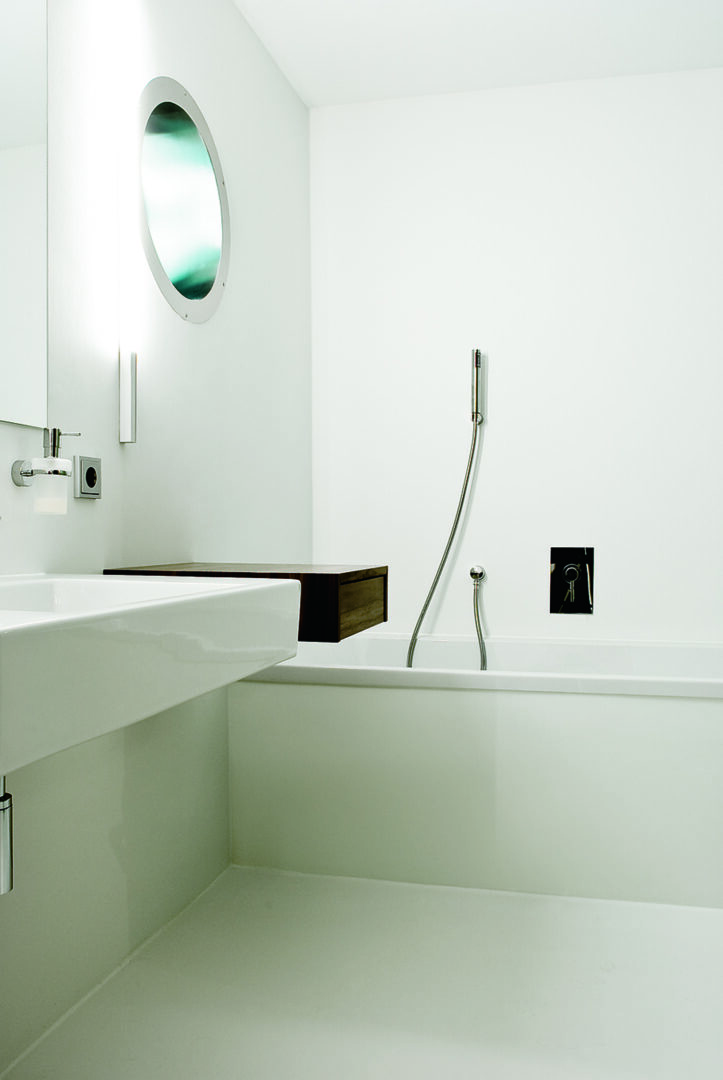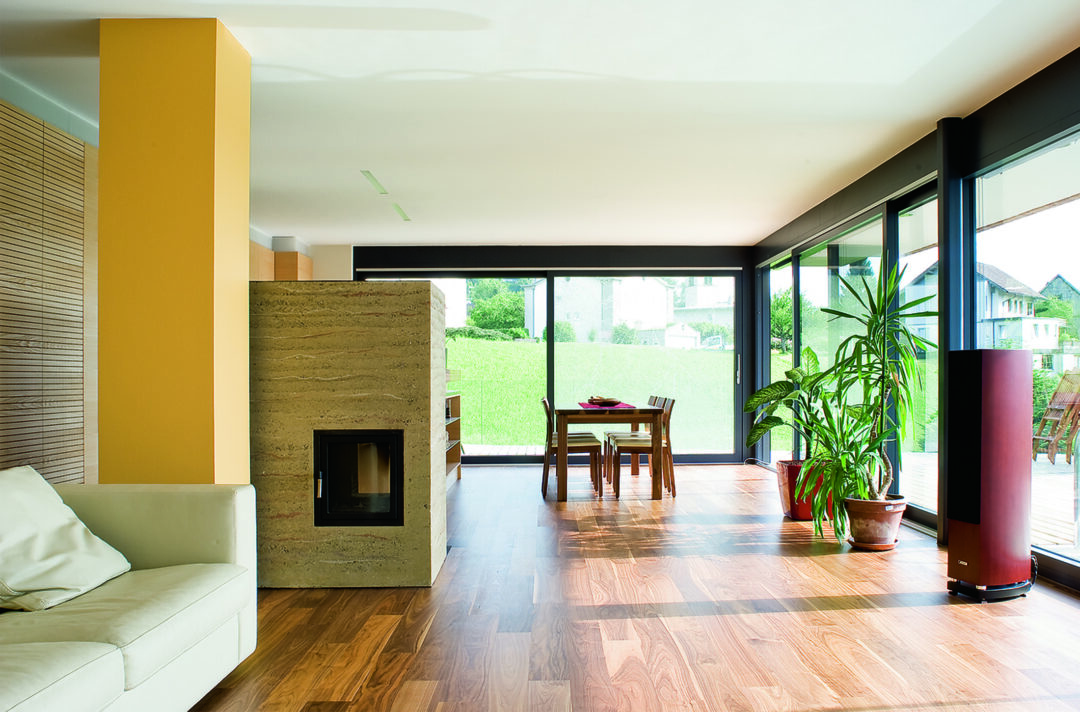 This cube with a flat roof is elegant, luxurious and simple. With its brick facade it seems to be set into the slope like a gemstone. Due to the hillside location, the house is facing west. Lots of glass ensures a good climate and lots of light. Due to the change in elevation, the house´entrance is on the top floor, which is also accommodates the garage. Living areas are on the two floors below, where people meet to live, cook and eat. The bedrooms and bathroom areas are located down one more floor.