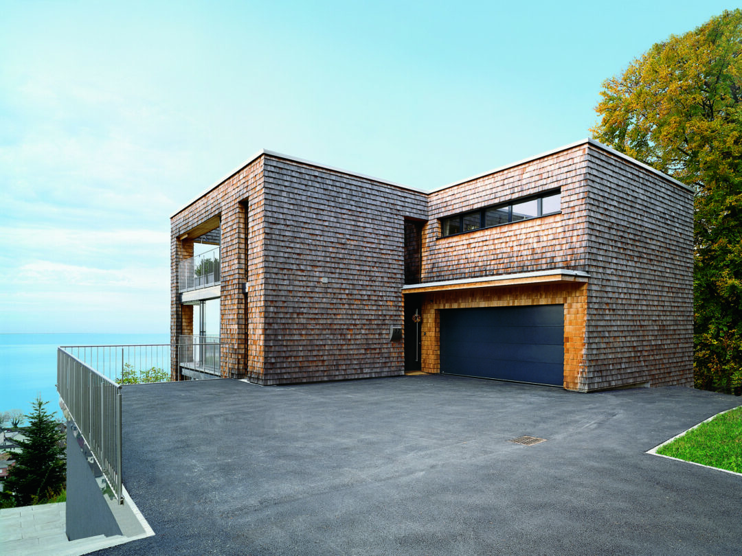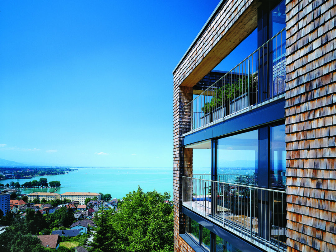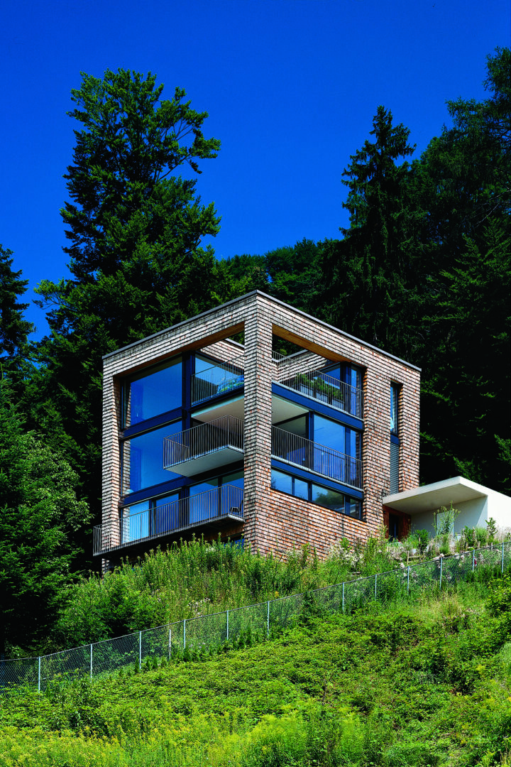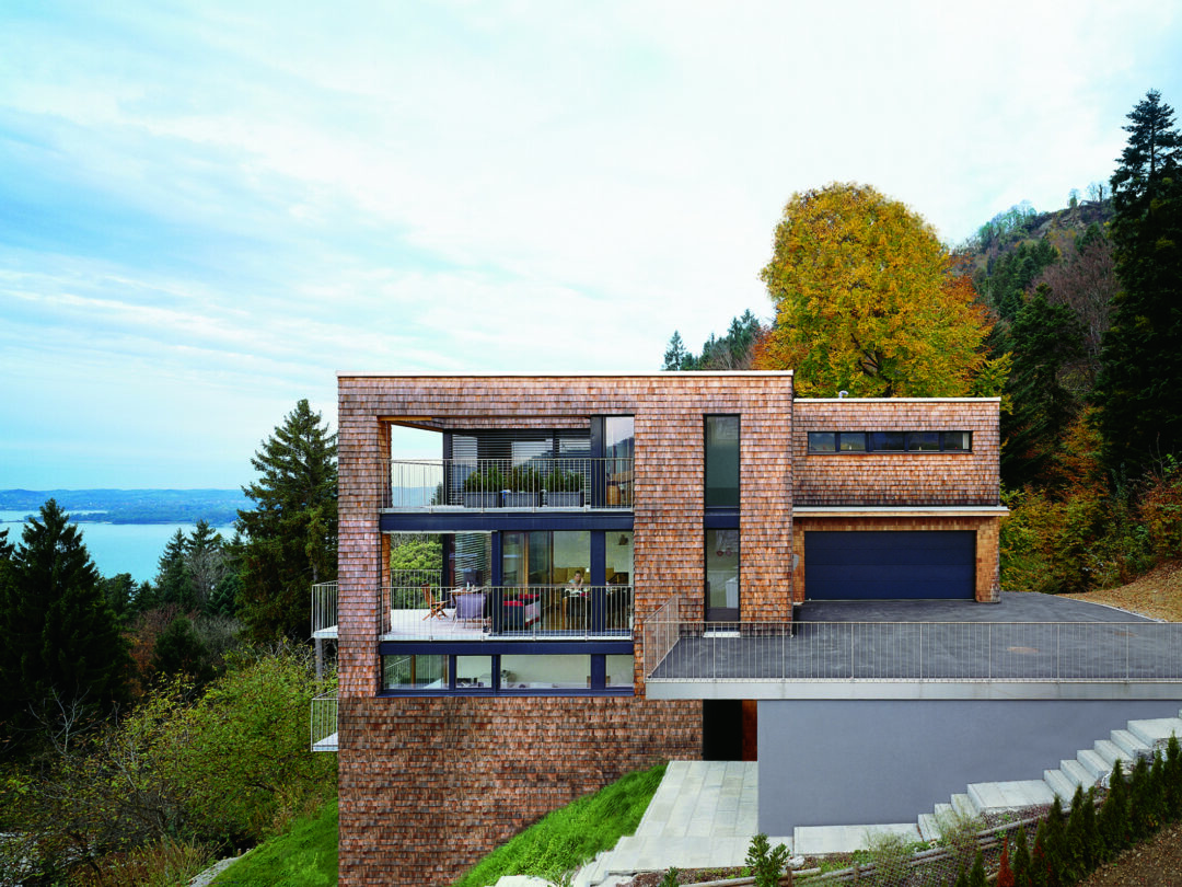 The location and views of this house with an in-law-suite are more than unique. The house is located at the top of a steep slope, right on the edge of the forest and is visible even from Bregenz. Since the terrain was to remain as untouched as possible, the slope presented interesting challenges. The result is a 4-story, tower-like cube that does not dig into the terrain, but leans against the slope. The floors are extensively glazed on all sides and the closed wall surfaces are reduced to a minimum in order to keep the breathtaking, unrestricted view over the entire Lake of Constance, the Rhine Valley and the Alps.