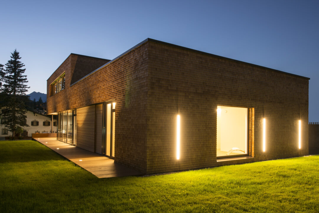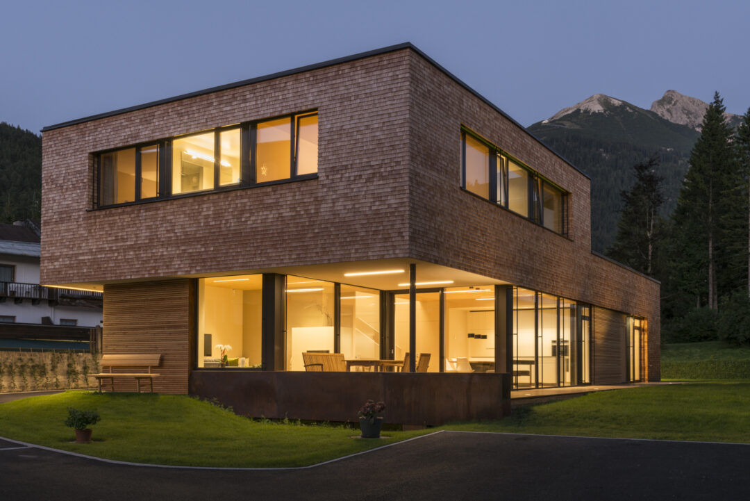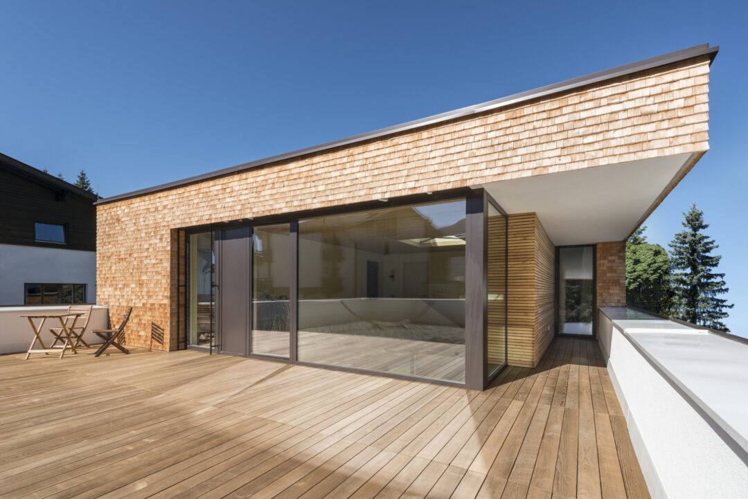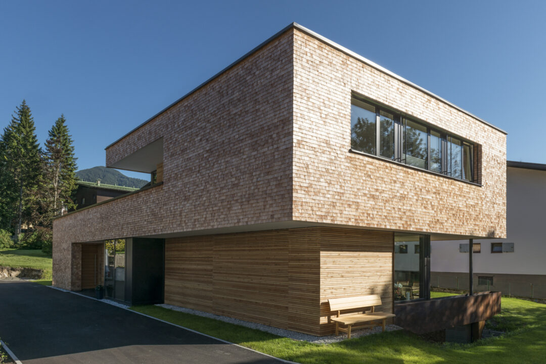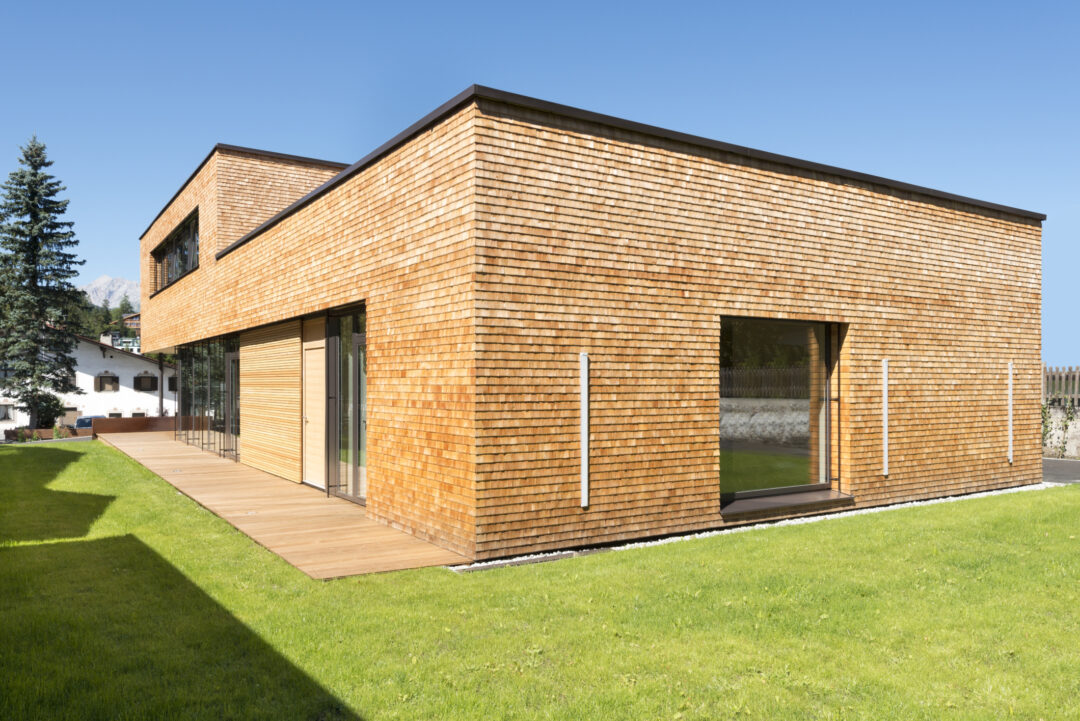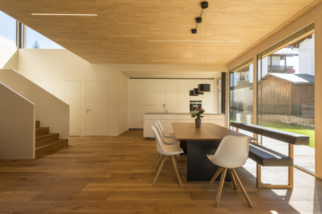 Larch wood shingles are not actually common locally, but are certainly justified in the central Alps. The client was born in the Bregenzerwald region and has a fondness for this natural type of facade: "Fortunately, my husband was also very fond of this idea, a modern house with a larch shell that turns a beautiful silver over time. The covered parts of the facade on the ground floor, however carry a larch shiplap that remains light and will therefore provide an interesting contrast. The entrance on the east side leads into a vestibule and into the foyer, which appears wonderfully bright from above thanks to the generous glazing. Solid oak floorboards also create a natural feeling indoors. A few color accents create a calm ambience in which openness and transparency to the surroundings are crucial.
