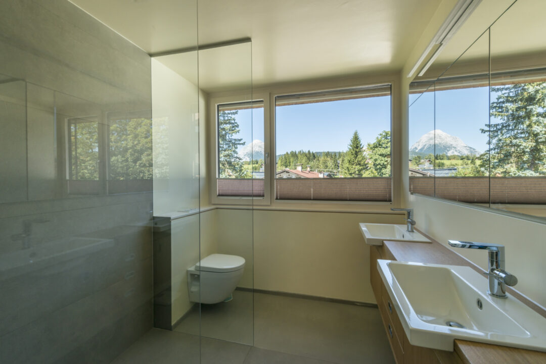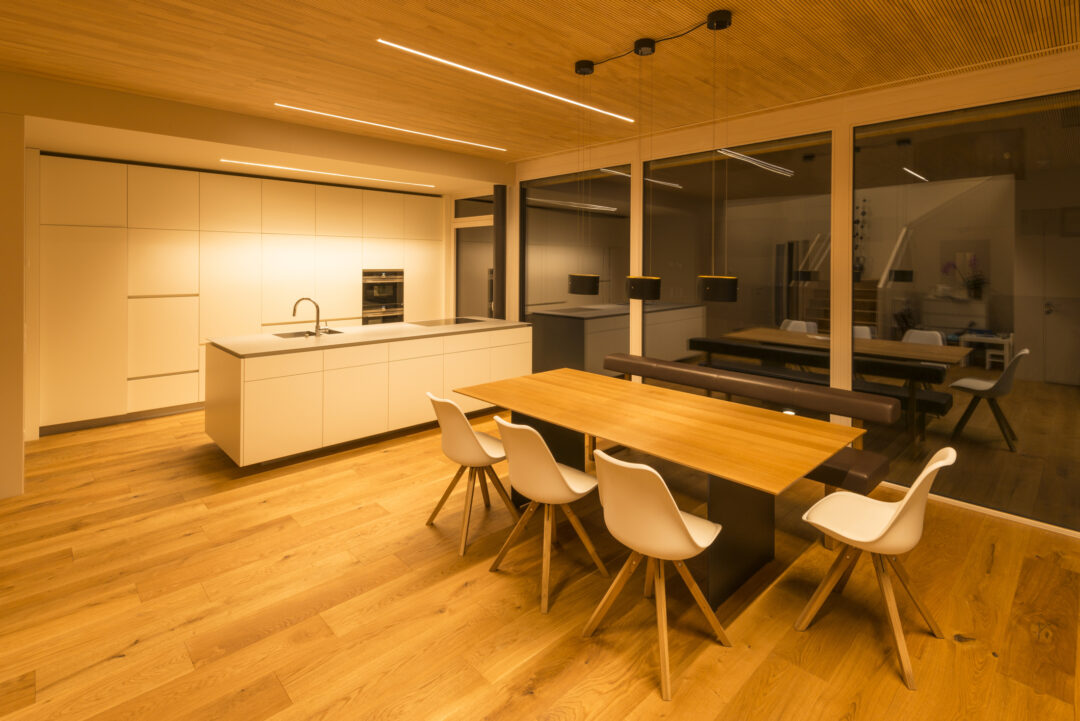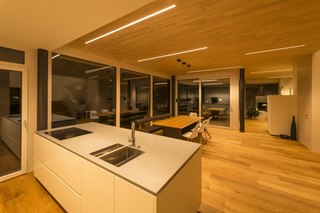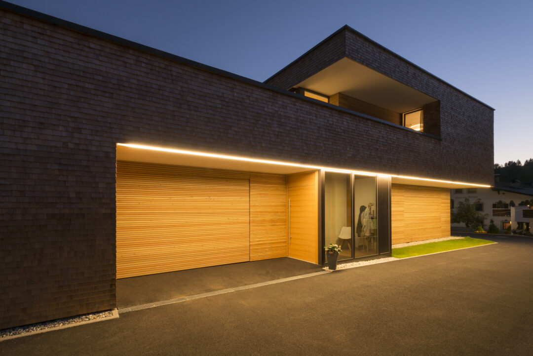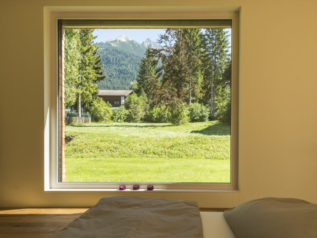Larch wood shingles are not actually common locally, but are certainly justified in the central Alps. The client was born in the Bregenzerwald region and has a fondness for this natural type of facade: "Fortunately, my husband was also very fond of this idea, a modern house with a larch shell that turns a beautiful silver over time. The covered parts of the facade on the ground floor, however carry a larch shiplap that remains light and will therefore provide an interesting contrast. The entrance on the east side leads into a vestibule and into the foyer, which appears wonderfully bright from above thanks to the generous glazing. Solid oak floorboards also create a natural feeling indoors. A few color accents create a calm ambience in which openness and transparency to the surroundings are crucial.