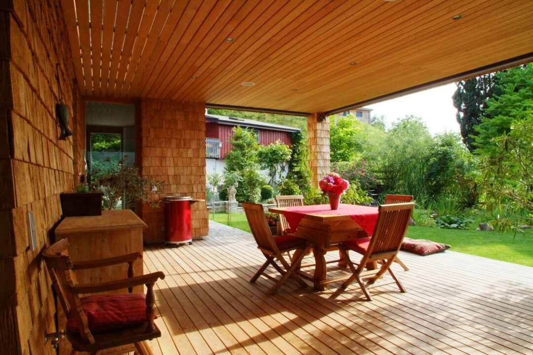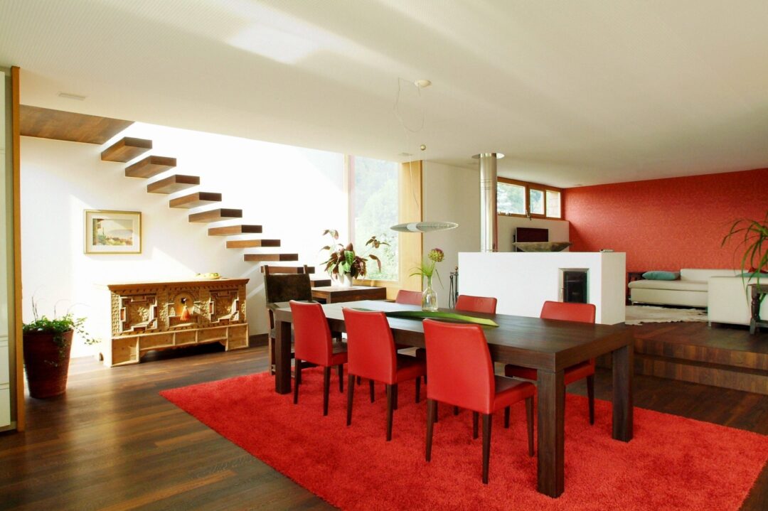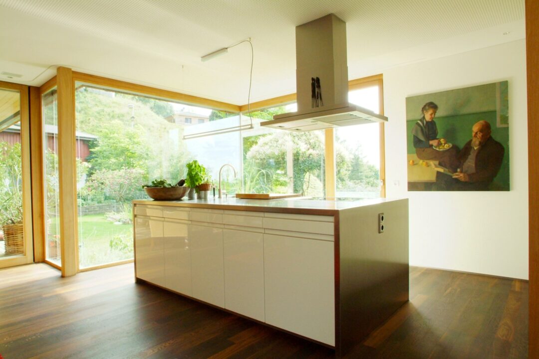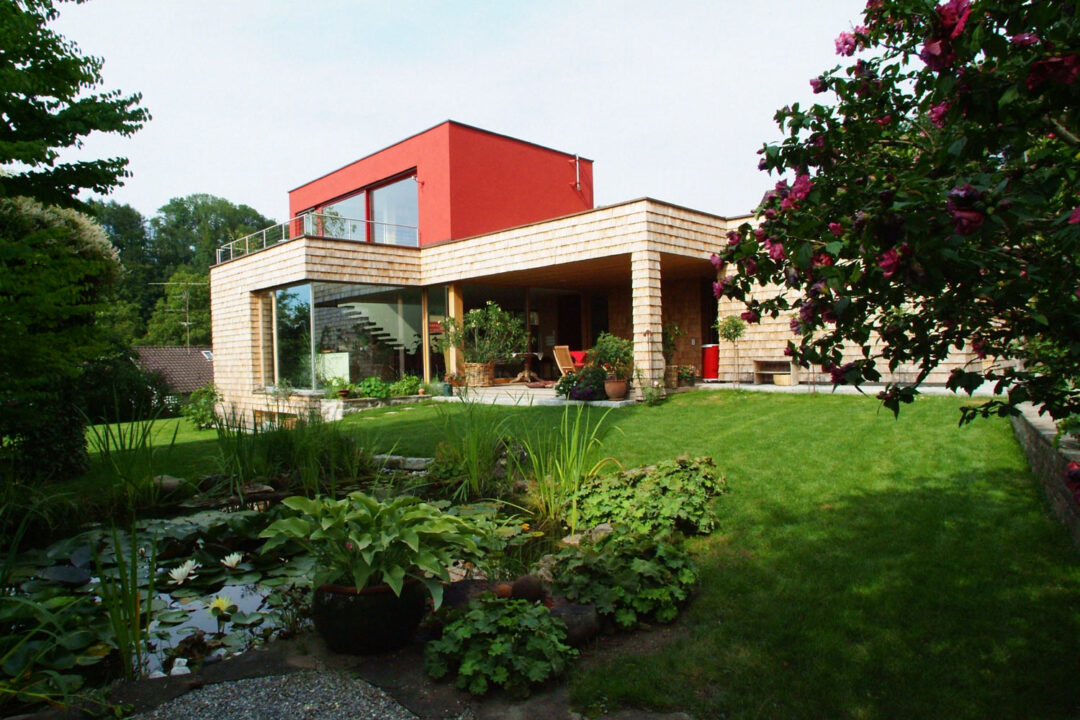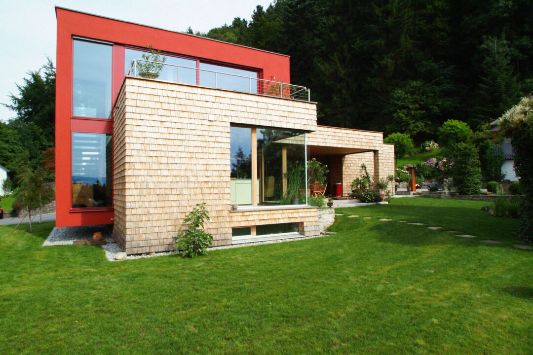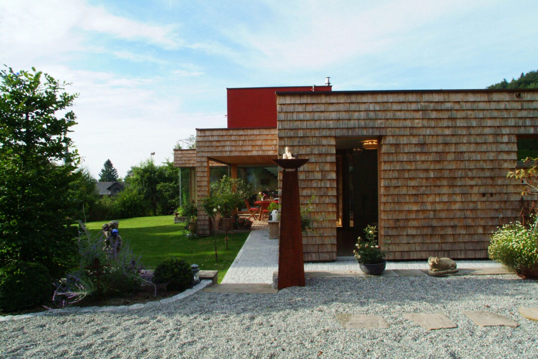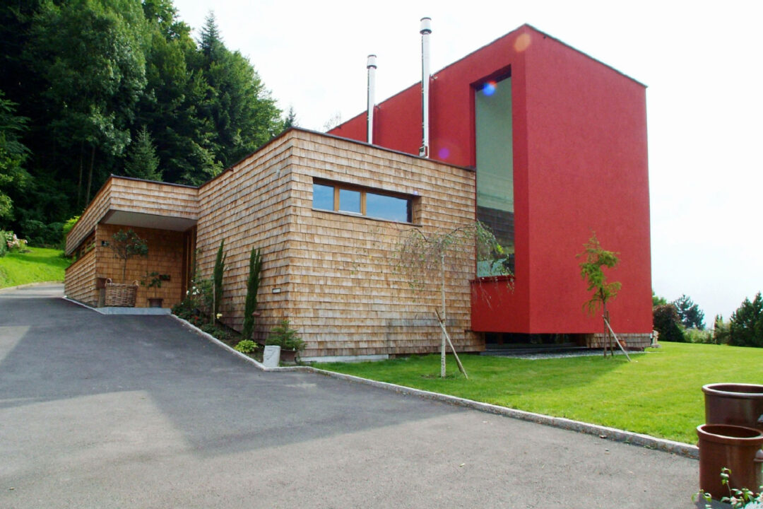 The single-family home is located on a small hill above Schwarzach with a sweeping view over the Rhine Valley. The house is consistent of a shingled component and a plastered cube. Relation to the outside is of utmost importance in this project. The single-family home is heated using geothermal heat for a positive effect on the energy balance of the house.