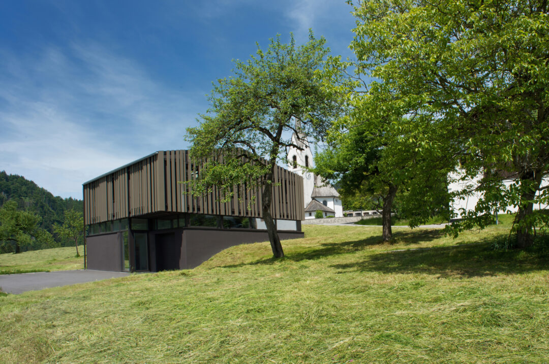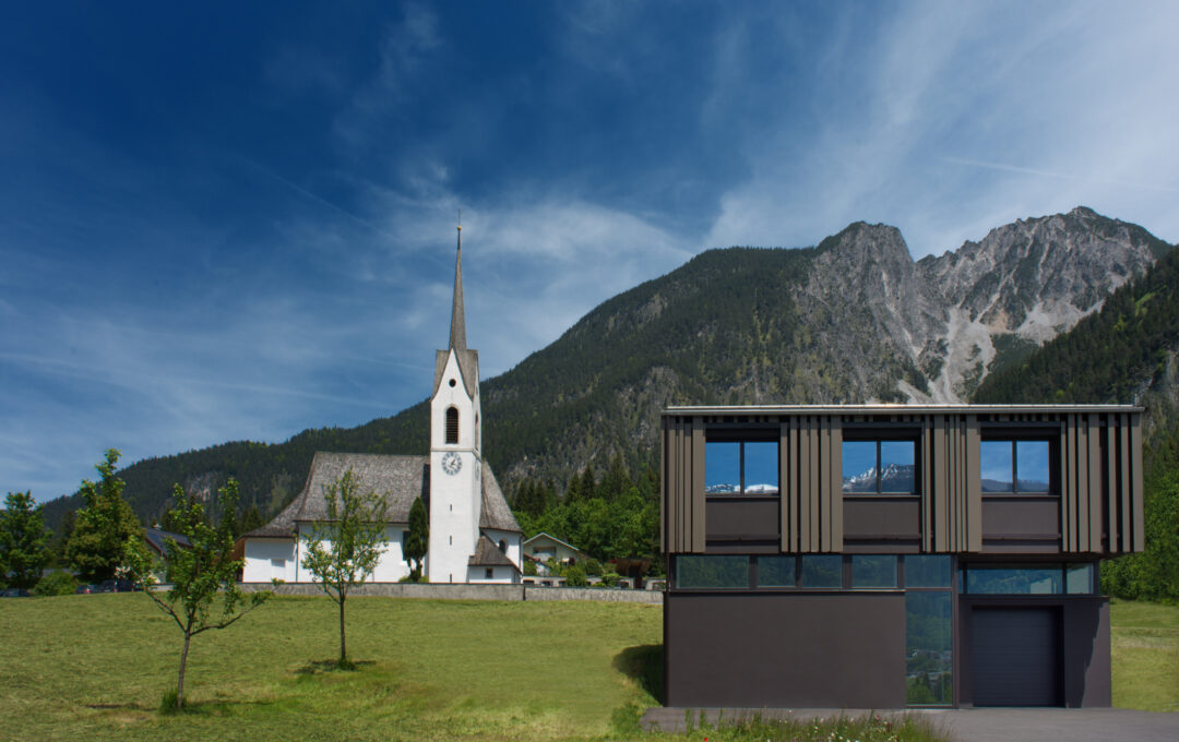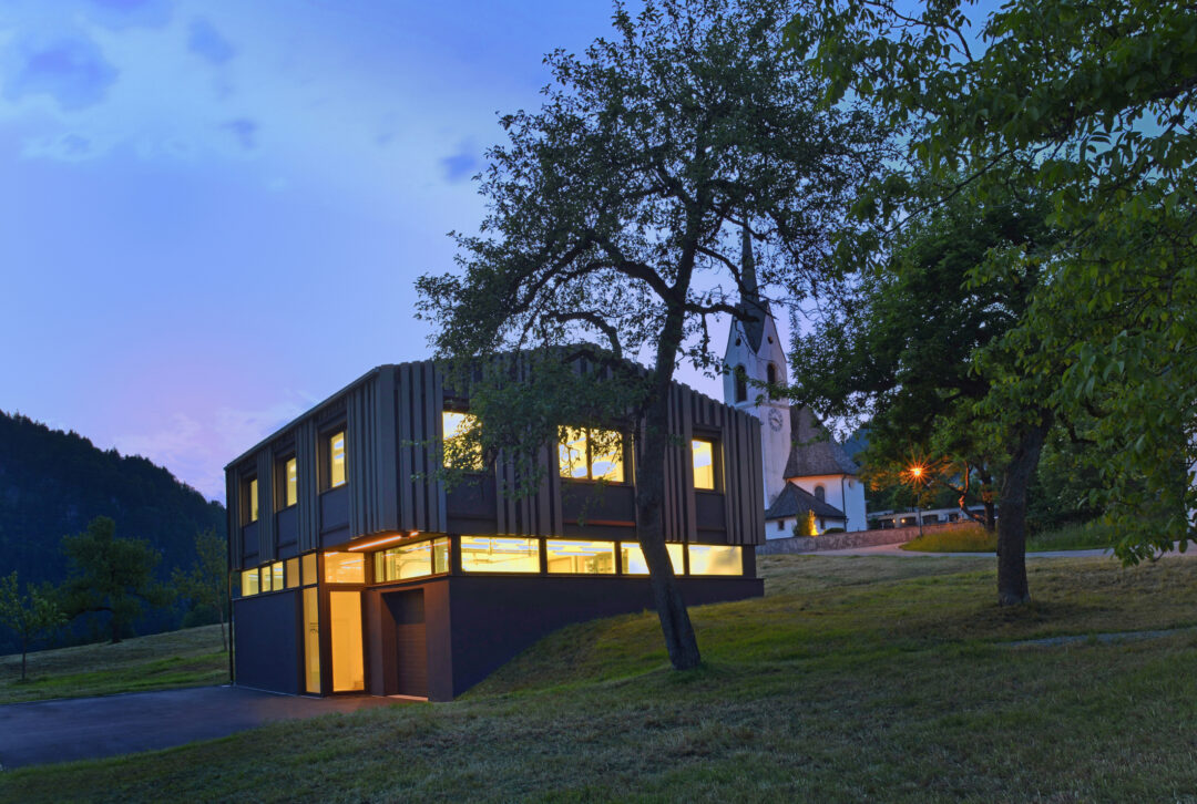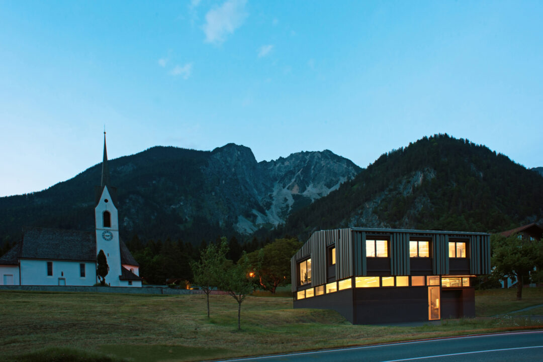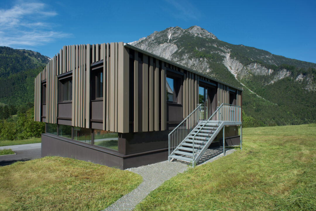 A new two-story building with modern office, laboratory and workshop space was built in Sankt Anton im Montafon for a small company in the mechatronics sector. The new company building with a usable area of approx. 2000 sqft is located on a spacious hillside plot with the possibility of expansion. It fits harmoniously into the surrounding area with only minimal changes to the terrain. The centrally located staircase leads from the laboratory on the ground floor to the upper floor with an open office and meeting rooms. A so-called drop shaft for various experiments could be adapted for an elevator.