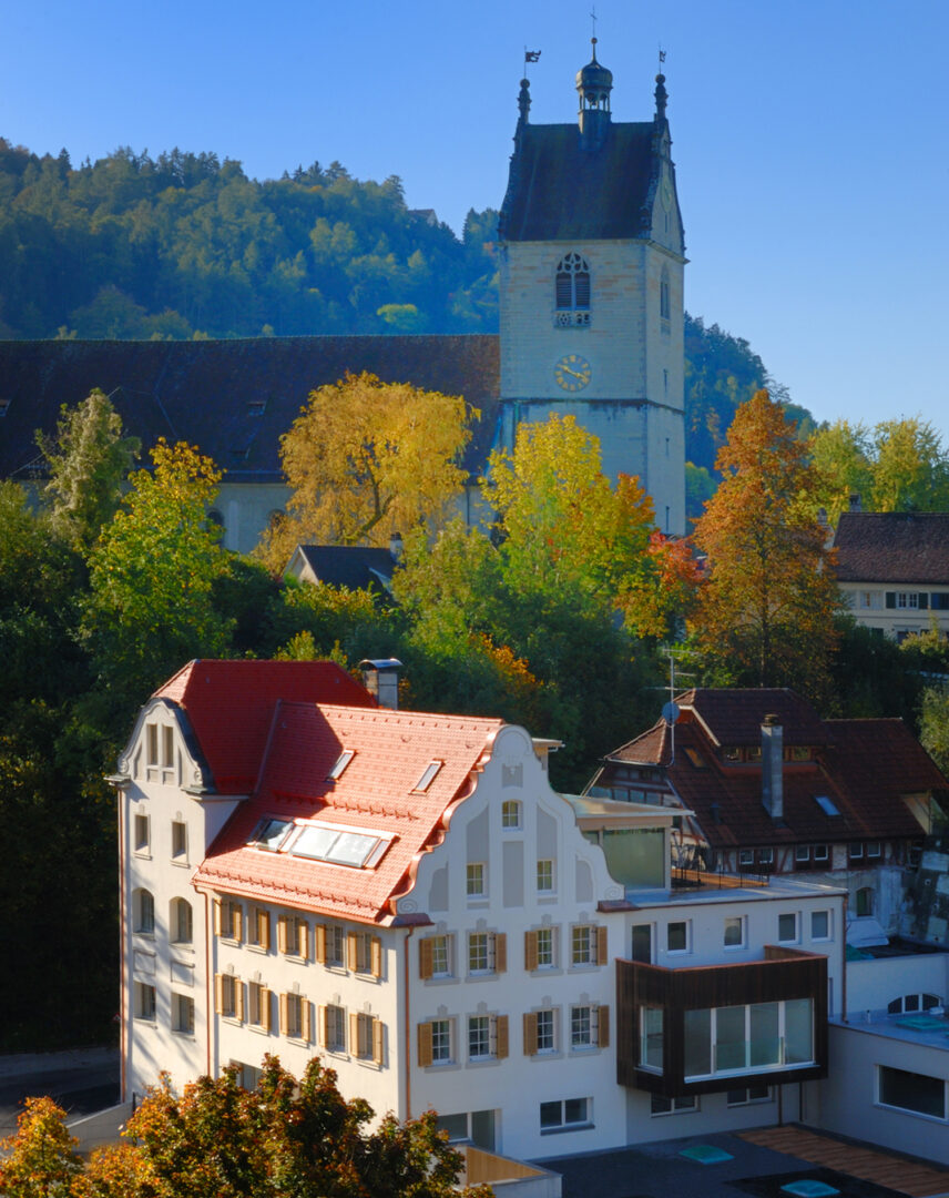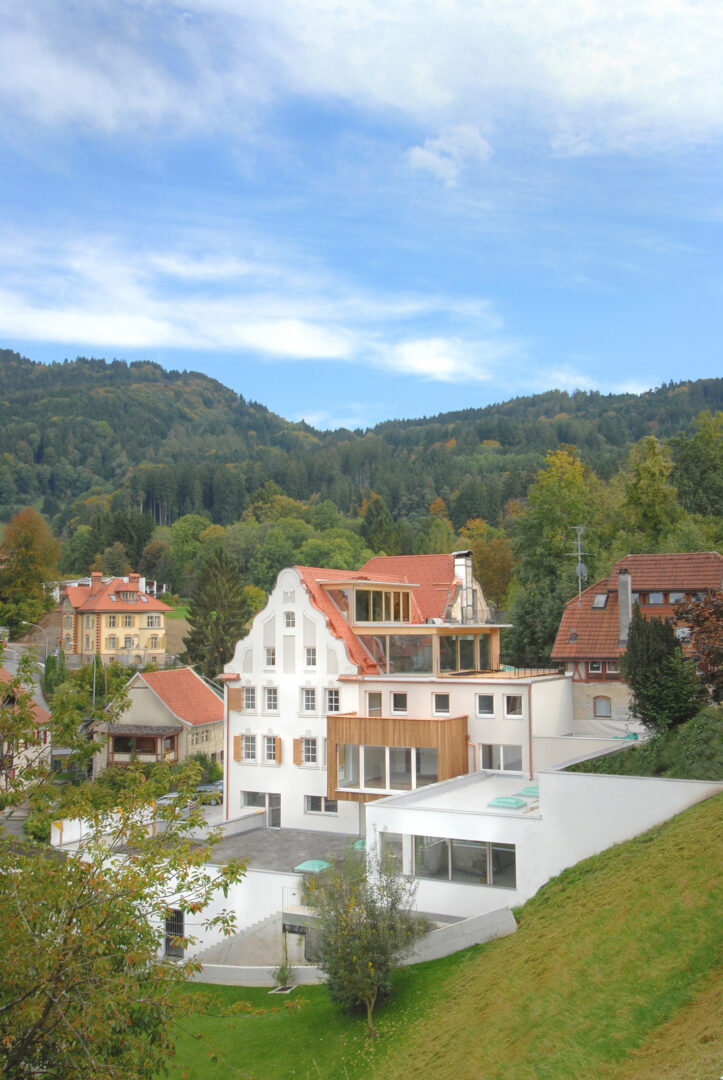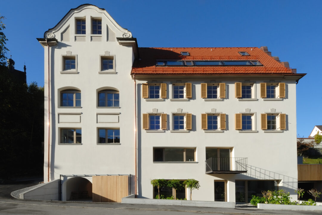The history of the “Löwen” - the former Löwenbrauerei Bregenz - goes back several hundred years. Originally it only consisted of the storage cellar with its thick stone walls, used for the cool storage of beer. It was only at the beginning of the last century that the “Golden Lion Brewery” was built on the existing cellar vaults with the now familiar and characteristic Art Nouveau building. Through the gentle revitalization, the existing building structure was redesigned and the historical jewel was given a contemporary use. The official classification as a building worth preserving meant that the original character of the main building, including the tower, had to be preserved. For the sake of the original look, the external walls were not insulated at all. Instead of automatic roller blinds, wooden shutters were used to match the Art Nouveau facade.