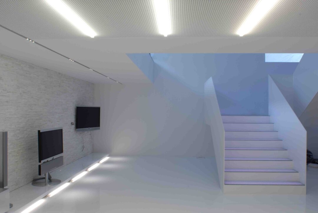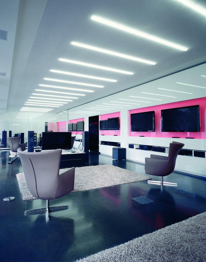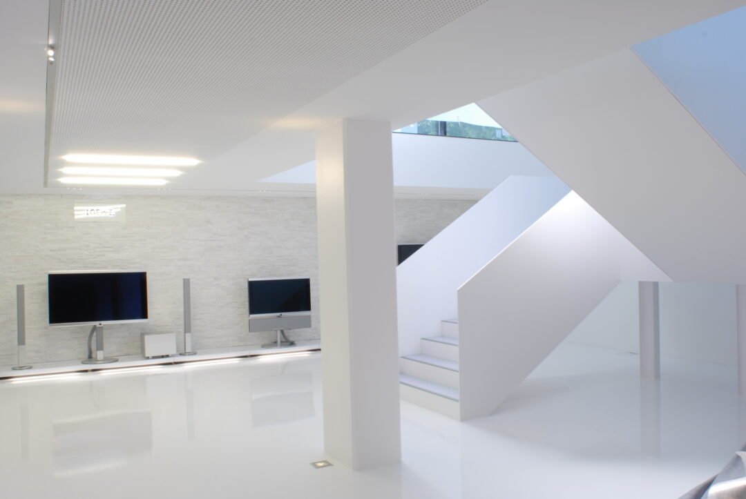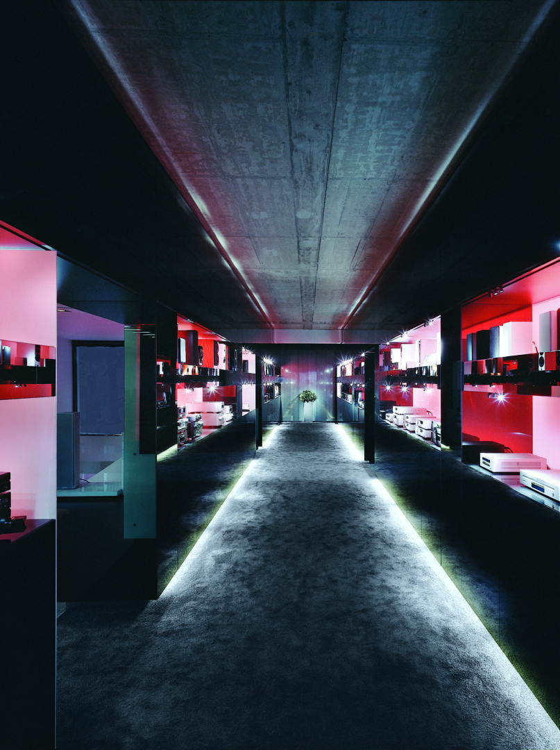 The "VISIONS AND MORE" showroom is an exclusive sales and service store for high-quality HIFI equipment. The approach and claim at the same time was to put the product and the product staging in the foreground. This was implemented through a limited choice of materials and a reduction to the essentials. A balancing act between an atmosphere that did not appear too slick and the product presentation. The structure of the existing multi storied building was not changed - the concept was adapted to the existing column structure. Thanks to its strict positioning, this created a path along a tunnel and down a steel staircase to the basement.